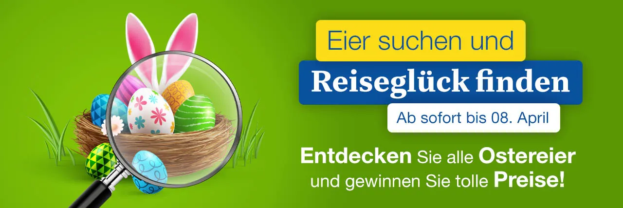 Damit Sie nicht wahlos auf unserer Website stöbern müssen, geben wir Ihnen an dieser Stelle bereits einen ersten Hinweis: Alle Ostereier, die wir für Sie versteckt haben, finden Sie in der Reiseauswahl, die wir unten für Sie bereitgestellt haben ... Es lohnt sich demnach, sich intensiv mit genau diesen Reisen auseinanderzusetzen!